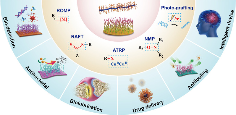 聚合物分子刷是指大分子链一端以化学或物理相互作用固定在基底表面(或聚合物链)上所形成的一类特殊结构高分子材料,由于高密度分子链之间的位阻排斥使聚合物链呈高度伸展构象,形成类似于“刷子”的结构。聚合物刷作为一种强大的表面功能化改性方法,在表面科学与技术领域具有广阔的应用前景。
